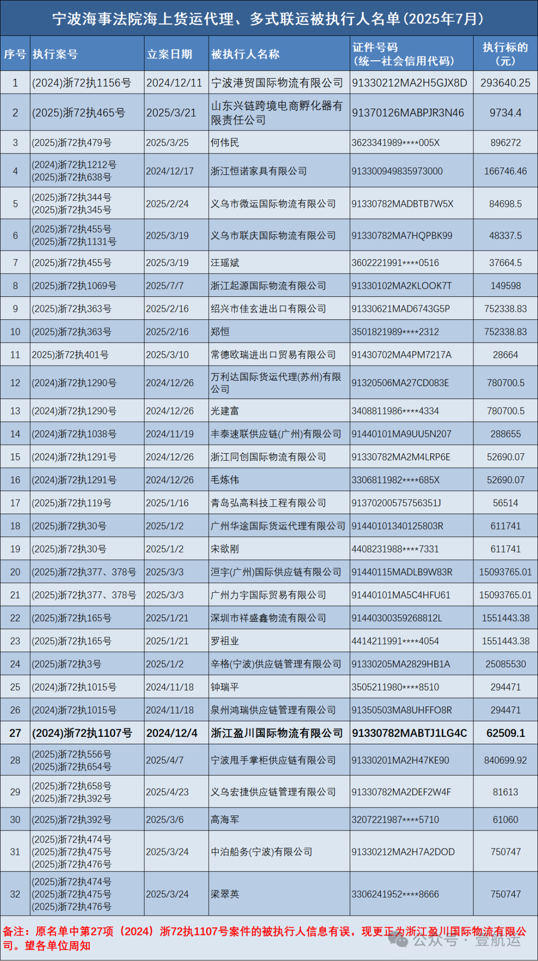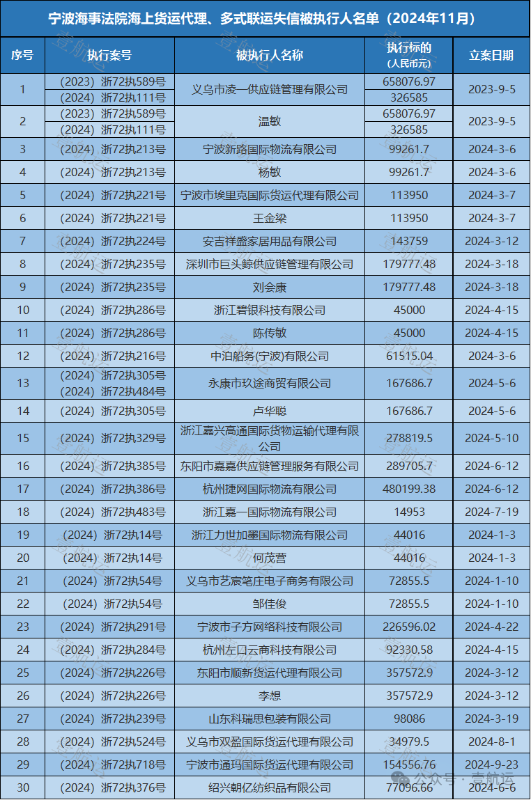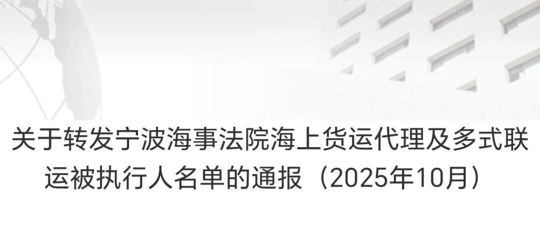 据最新获悉:上周二(11月18日),宁波市国际货运代理协会通过官网转发了一份“宁波海事法院海上货运代理及多式联运被执行人名单的通报(2025年10月)”的最新情况通报。