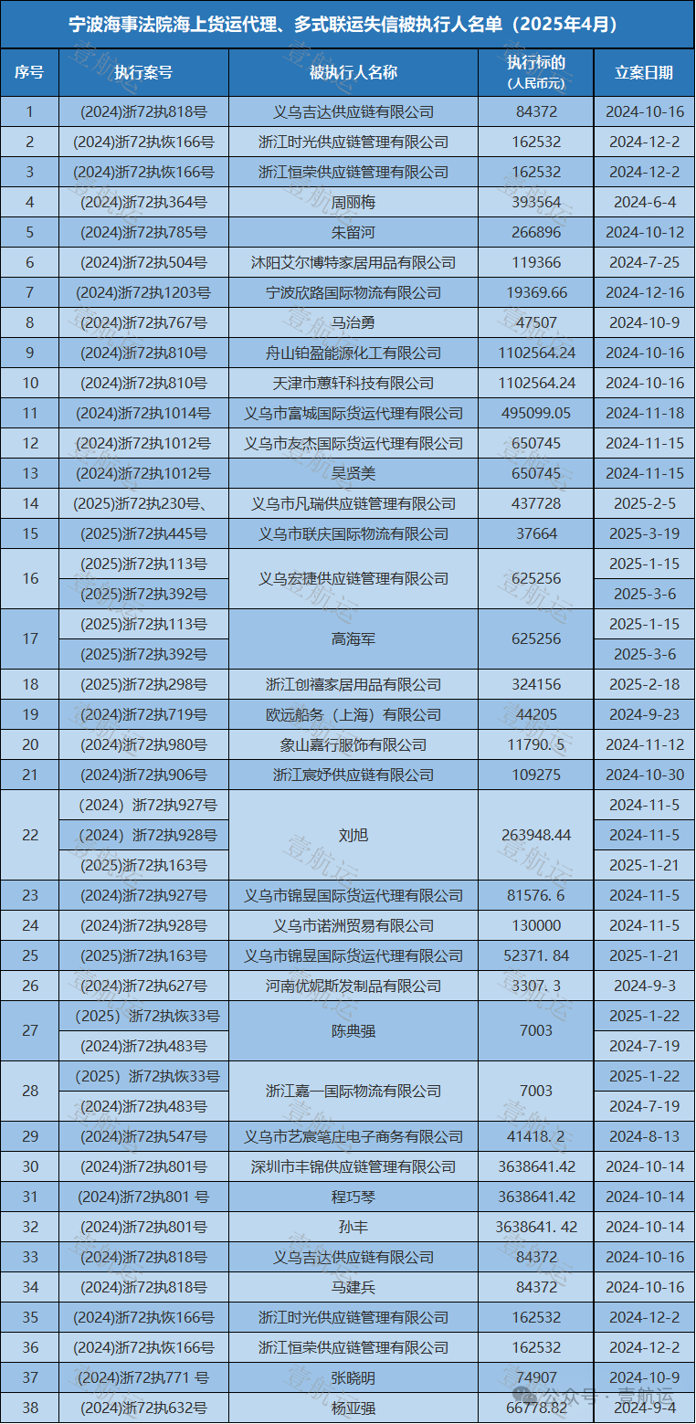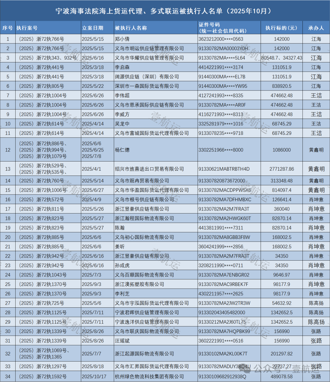 以下为最新一期货代被执行人名单出炉(2025年10月),新增名单包含34家国际货运代理及多式联运、货主企业及个人的被执行详细情况:
