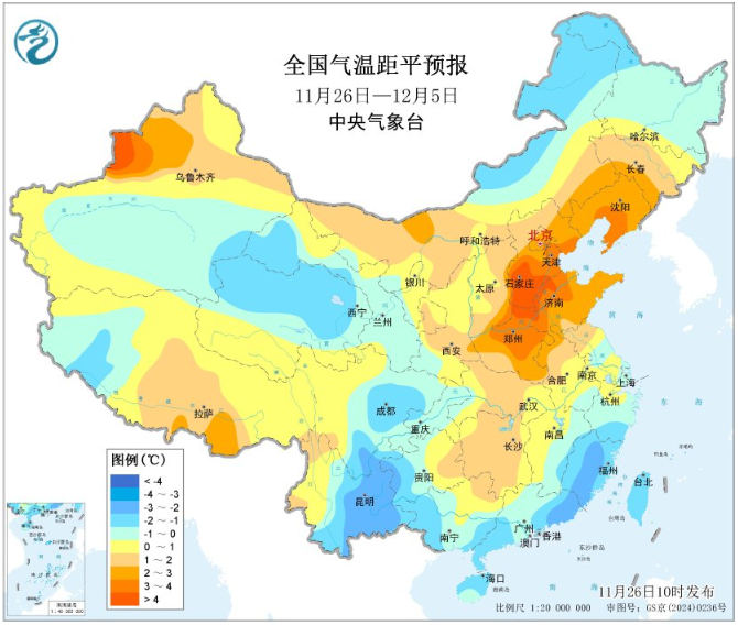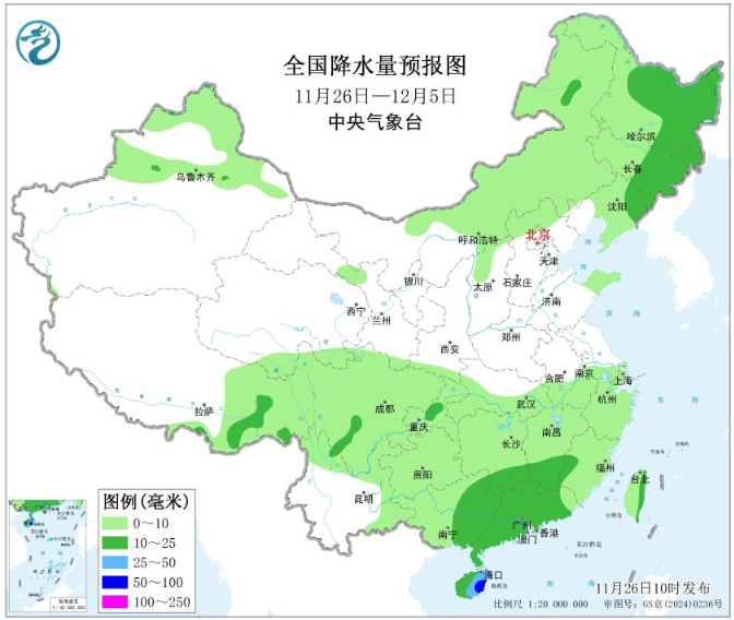 未来10天(11月26日-12月5日),新疆北部、内蒙古中东部及东北地区有1~5毫米降水,东北地区东部的部分地区降水10~20毫米,江南南部、华南西部等地部分地区有10~20毫米,局地超过25毫米,中东部其他大部降水稀少。
