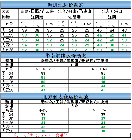 北方到太仓运价4-5.7万吨运价下跌9元为30元;