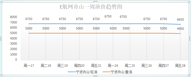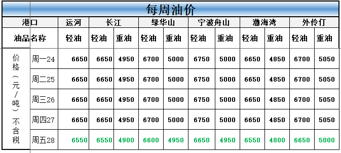 本周末外港轻重油价格均小幅下跌,其中轻油共下跌100元/吨。重油下跌50元/吨;具体见下表。