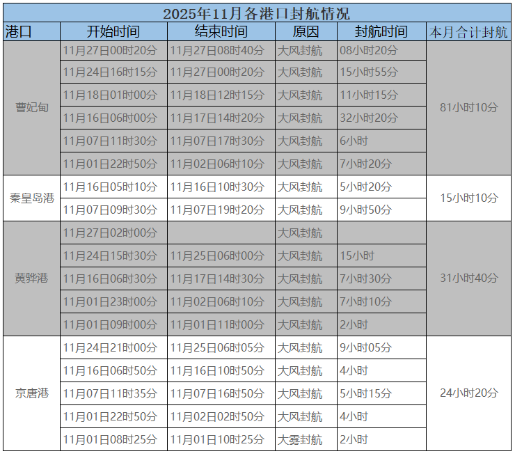 2025年11月下旬,近期北方各大港口封航较频繁:
