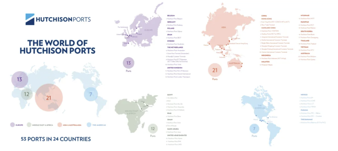 自上世纪90年代起,李嘉诚便已通过和记港口控股在全球港口领域打下深厚根基。资料显示,长和旗下的和记港口有3万名员工,在24个国家经营53个港口及码头。和记港口网站的分布图显示,其在亚洲及澳大利亚经营21个港口,除了中国内地与香港的10个,其他港口分布在印尼、巴基斯坦、韩国、越南等。该公司在欧洲7个国家经营13个港口,在中东及北非地区的5个国家经营12个港口,在3个美洲国家经营7个港口。