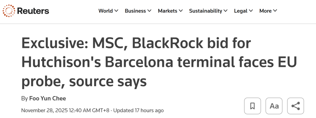 据路透社消息,由贝莱德(BlackRock)和 MSC 联手竞购长和旗下大部分全球港口业务的交易,目前在欧洲面临障碍。一位知情人士周四透露,欧盟反垄断监管机构正准备对该交易中涉及的西班牙部分进行深入调查。