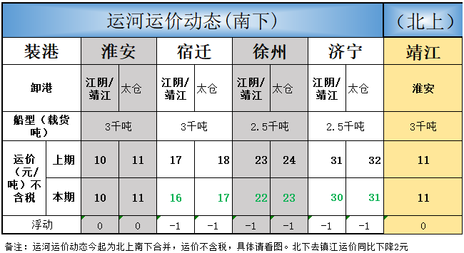 济宁到江阴/靖江运价下跌1元为30元/吨;
