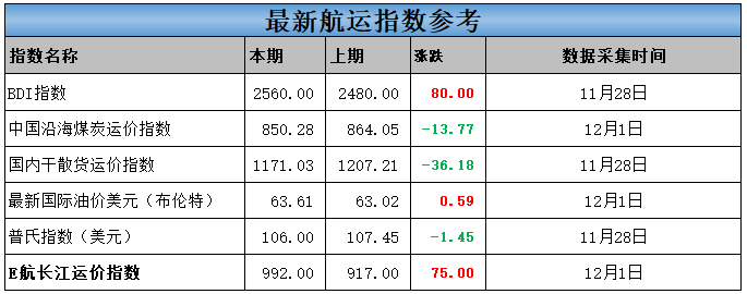 沿江主力电厂冬储煤开始进行,需求开始增加;长江内河货源补充有所改善,非电领域建材、化工等行业受终端需求也有增加,运价也受到支撑上涨。后期需重点关注枯水期水位变化对船舶实际载重的持续影响。