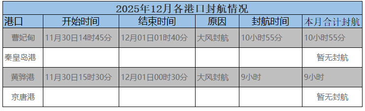 2025年12月01,近期北方曹妃甸和黄骅港有大风封航,其他各大港口暂无封航: