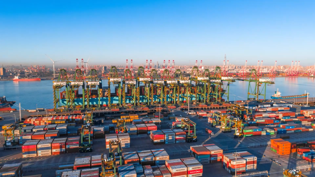 这是天津港太平洋国际码头,12台岸桥,同时作业399米的“莫斯科马士基”轮。结果是多少?每小时506自然箱。简单一算,一台岸桥是42自然箱/小时。这个效率,放到全球,也很能打。