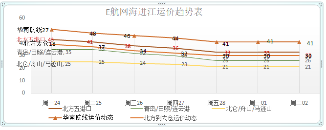 (绿色字体代表运价下调,红色字体代表上浮)沿海运价本周走势图