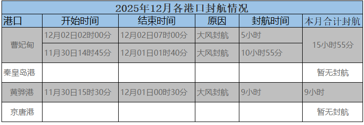 2025年12月02,近期北方曹妃甸和黄骅港有大风封航,其他各大港口暂无封航: