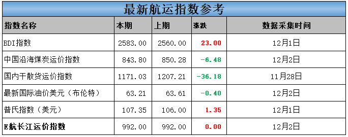 沿江主力电厂冬储煤开始进行,需求开始增加;长江内河货源补充有所改善,非电领域建材、化工等行业受终端需求也有增加,运价也受到支撑。后期需重点关注枯水期水位变化对船舶实际载重的持续影响。