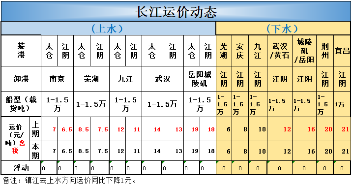 北方五港方向进江各类型船舶运价均暂维稳;