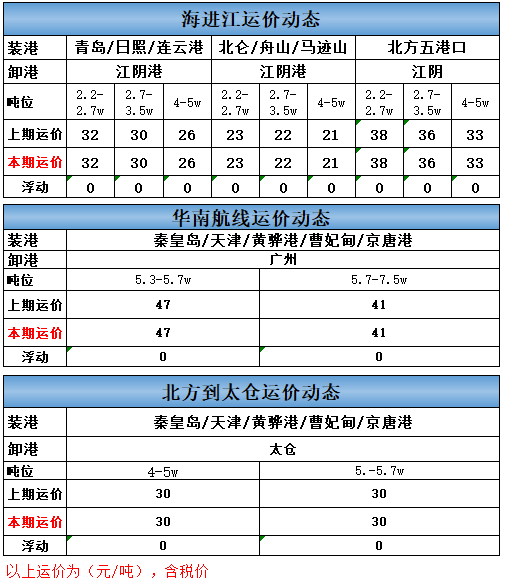 北方到太仓航线4-5万运价无变化。5-5.7万吨运价无变化。