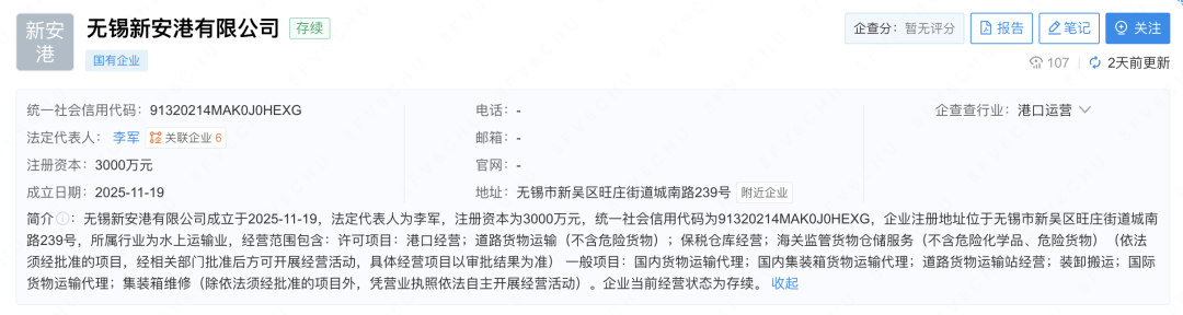 企查查信息显示,无锡新安港有限公司于日前成立,注册资本3000万元,所属行业为水上运输业,经营范围包含港口经营、道路货物运输(不含危险货物)、保税仓库经营、海关监管货物仓储服务(不含危险化学品、危险货物)、国内货物运输代理、国内集装箱货物运输代理等。