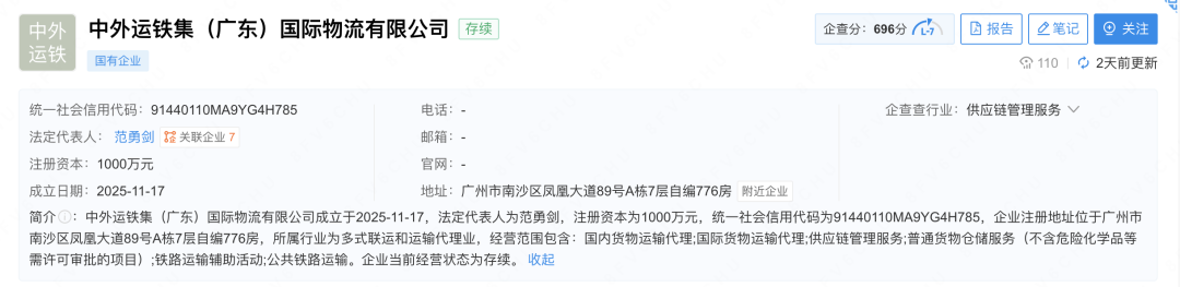 此外,中外运铁集(广东)国际物流有限公司也于近期成立,注册资本1000万元,所属行业为多式联运和运输代理业,经营范围包含国内货物运输代理、国际货物运输代理、供应链管理服务、普通货物仓储服务(不含危险化学品等需许可审批的项目)、铁路运输辅助活动、公共铁路运输等。