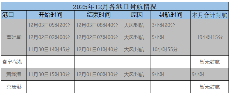 2025年12月03,近期北方曹妃甸频繁短时间大风封航,其他各大港口暂无封航: