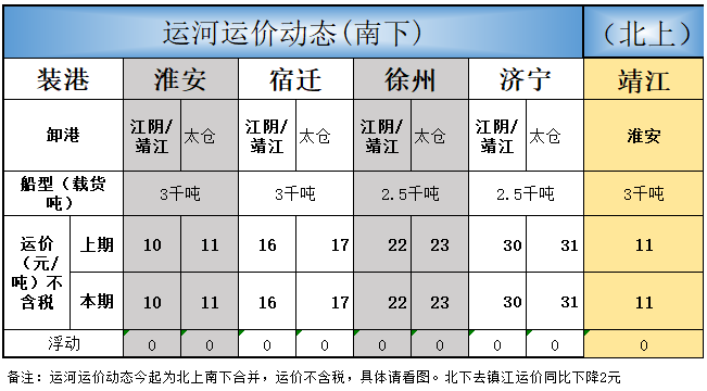 运河运价分析主要基于具有行业一定权威性的多家船东提供出来的运价数据,仅供参考。