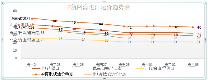 (绿色字体代表运价下调,红色字体代表上浮)沿海运价本周走势图