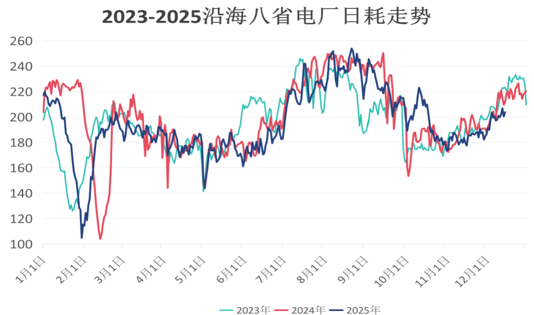 从基本面来看,当前各地气温逐步回升。尽管十二月中下旬冷空气活动频繁,但整体强度偏弱,电厂日耗煤需求提升空间有限。与历年同期相比,十二月下旬电厂日耗已基本进入冬季相对高位阶段,后续增长预期较弱。此外,长协煤与进口煤的稳定供应有效缓解了终端采购压力。尽管近期市场传闻国家能源集团计划讲暂停进口煤采购,但对整体市场的支撑作用较为有限。
