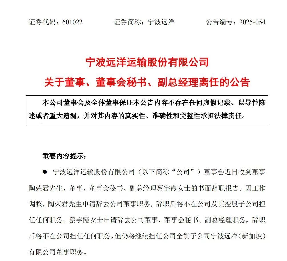 公告称,公司董事会近日收到董事陶荣君先生,董事、董事会秘书、副总经理蔡宇霞女士的书面辞职报告。因工作调整,陶荣君先生申请辞去公司董事职务,辞职后将不在公司及其控股子公司担任任何职务。蔡宇霞女士申请辞去公司董事、董事会秘书、副总经理职务,辞职后将不在公司担任任何职务,但仍将继续担任公司全资子公司宁波远洋(新加坡)有限公司董事职务。