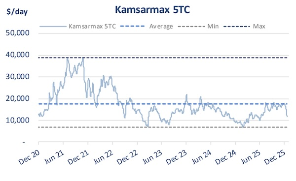 报告称,2025 年干散货市场的复苏覆盖主要船型,且下半年波动显著放大。其中,海岬型船成为全年表现最为抢眼的板块,日租金水平从年初约 7000–10000美元快速上行,并在 12 月一度逼近 4.5 万美元。相比之下,中型船市场虽缺乏剧烈行情,但展现出更强的稳定性:Kamsarmax 船型年中回升至 1.5–1.8 万美元区间;Ultramax 船型在年内触及约 1.8 万美元高点,尽管四季度有所回调,但整体仍高于历史均值;灵便型船则全年稳步走高,年底日租金约 1.6 万美元。