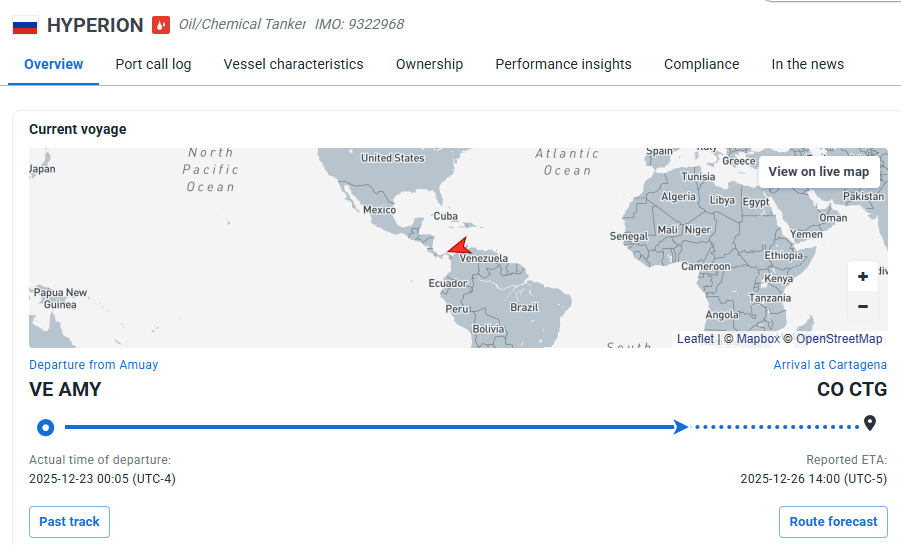 Marine Traffic数据则显示,“Hyperion”号悬挂俄罗斯旗,已经进入哥伦比亚海域附近,正向卡塔赫纳港前行。