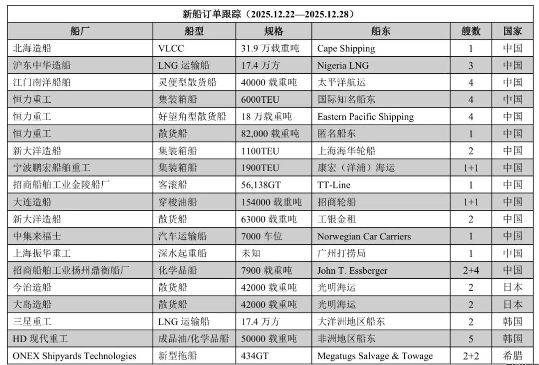 6【订单据国际船舶网跟踪:2025年12月22日至2025年12月28日,全球船厂共接获41+8艘新船订单。其中中国船厂接获28+6艘新船订单;日本船厂接获4艘新船订单;韩国船厂接获7艘新船订单;希腊船厂也接获相关新船订单。