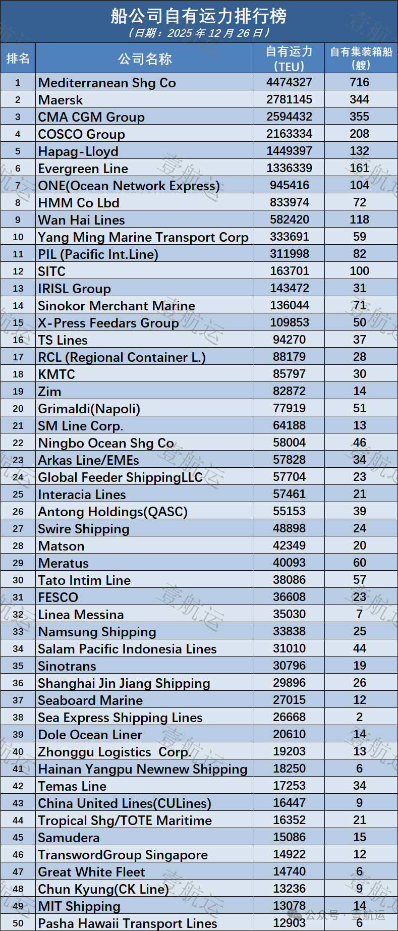 今天,E航网为大家带来业界首份全球集装箱班轮公司自有运力排行榜,带大家看看各大船公司的真实“家底”!