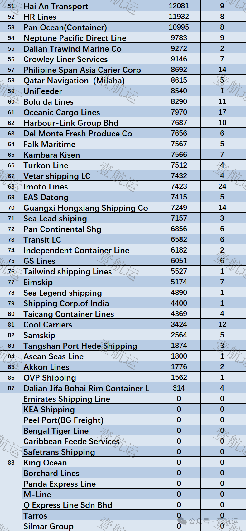 值得特别注意的是,现全球集装箱运力运力(自有运力+租用运力)TOP100中,有多达13家船公司旗下没有一艘自有船舶,自有运力为零!这意味着这些船公司所有船舶和运力均来自租赁市场。