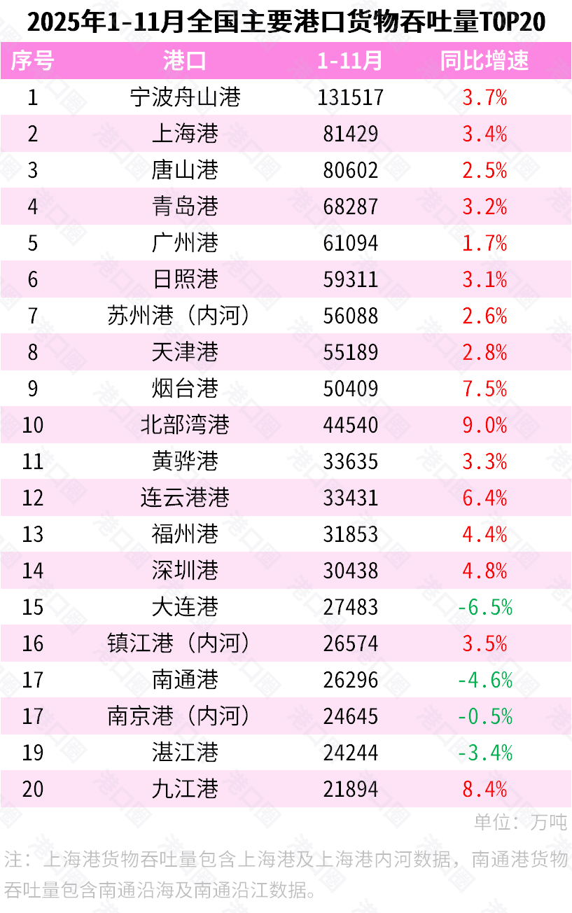 1-11月,全国主要港口货物吞吐量前十名为:宁波舟山港(第1)、上海港(第2)、唐山港(第3)、青岛港(第4)、广州港(第5)、日照港(第6)、苏州港(第7)、天津港(第8)、烟台港(第9)、北部湾港(第10)。TOP20中,排名同样未见变化。
