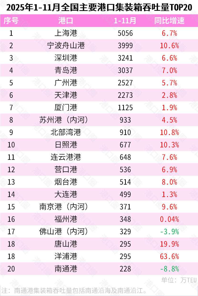 1-11月,全国主要港口集装箱吞吐量前十名为:上海港(第1)、宁波舟山港(第2)、深圳港(第3)、青岛港(第4)、广州港(第5)、天津港(第6)、厦门港(第7)、苏州港(第8)、北部湾港(第9)、日照港(第10)。