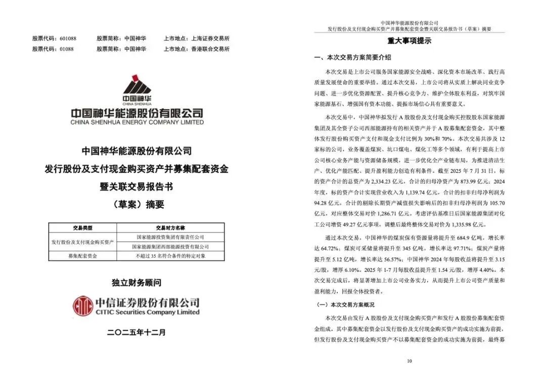 12月19日,中国神华能源股份有限公司发布公告,披露一项总对价高达1335.98亿元的重大资产重组计划:公司拟通过“发行A股股份+支付现金”的方式,收购控股股东国家能源集团旗下12家核心企业股权,业务覆盖煤炭、坑口煤电、煤化工及煤炭物流等关键环节。若顺利推进,这将成为A股历史上罕见的“千亿级”产业链一体化并购。