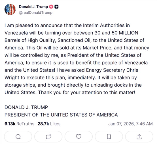 综合央视新闻等媒体报道,当地时间1月6日,美国总统特朗普宣布,委内瑞拉临时政府将向美国移交3000万至5000万桶石油。