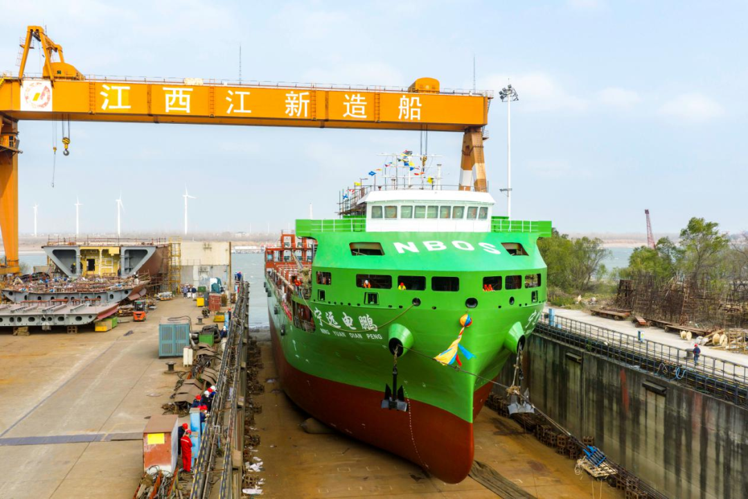 近日,宁波远洋740标准箱纯电动敞口集装箱海船2号船吉水仪式在江西江新造船厂顺利举行。这标志着全球最大、全国首批纯电动集装箱海船全部进入建造新阶段,公司绿色船队建设再获实质性进展。该船将在船厂继续进行码头舾装、系泊试验和试航等后续建造工作,于今年建成交付,正式投入公司内支线运营。