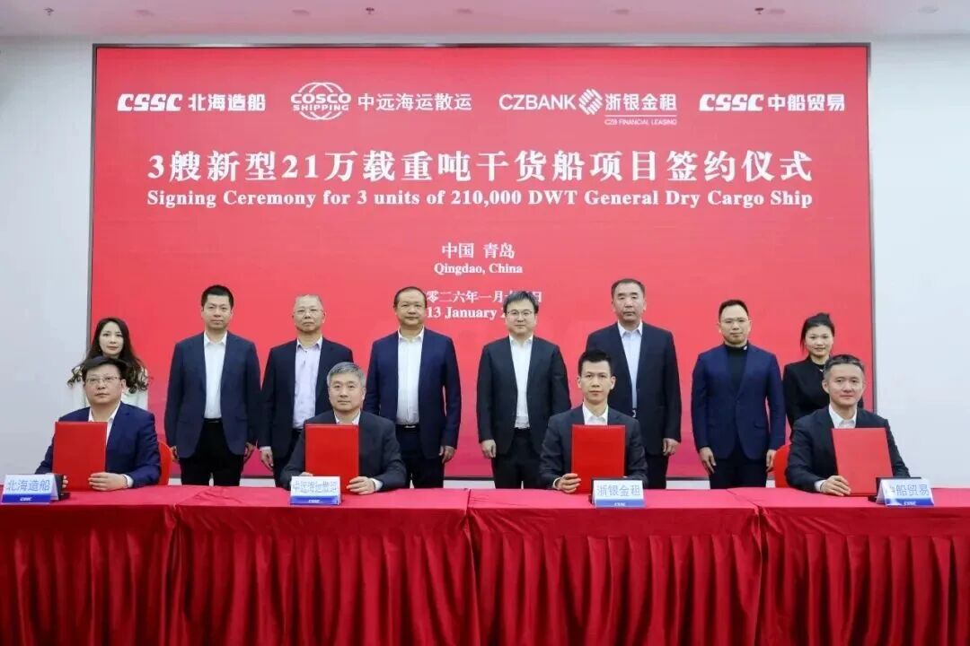 11月13日,中船集团旗下北海造船与中船贸易,携手浙银金租与中远海运散运完成3艘新型21万吨级干货船项目签约。入级CCS船级社。船舶总长299.9米、型宽50米、型深26.3米、结构吃水18.5米,按照披露信息,新船兼具散货、件杂货及集装箱等货物装载能力,实现了对传统21万吨船型的创新升级。
