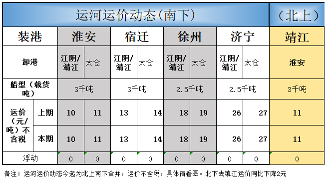 运河运价分析主要基于具有行业一定权威性的多家船东提供出来的运价数据,仅供参考。