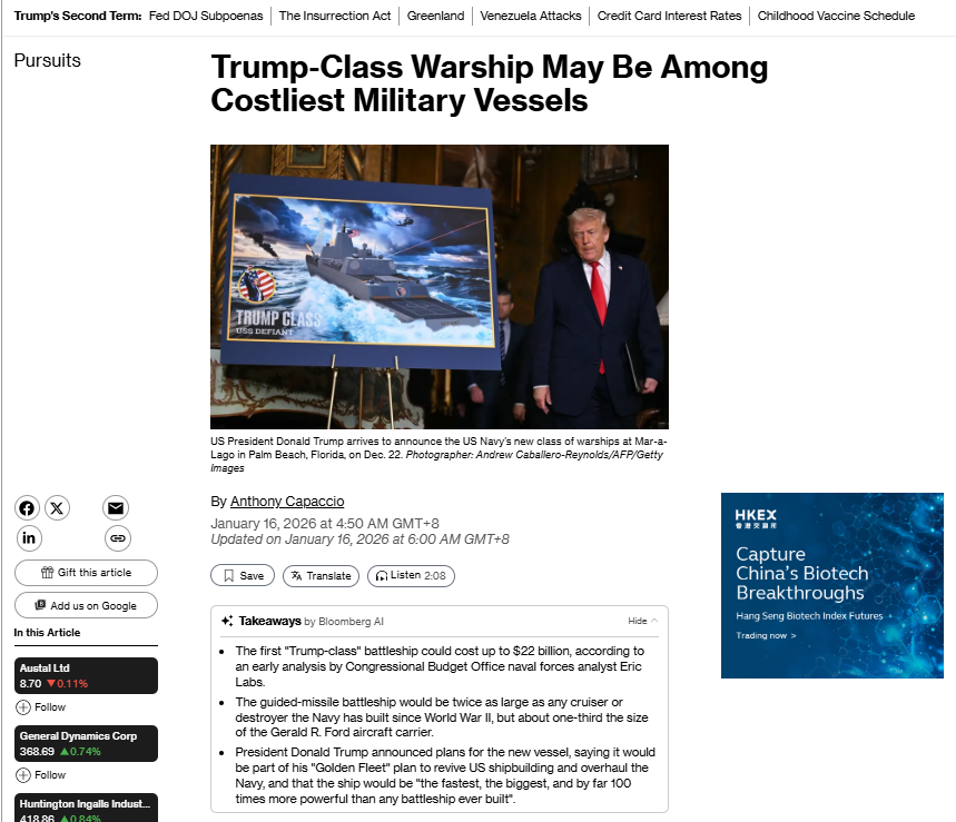 1月16日彭博社报道,美国海军拟建首艘“Trump-class(特朗普级)”导弹战列舰的早期成本评估上限被推到220亿美元。