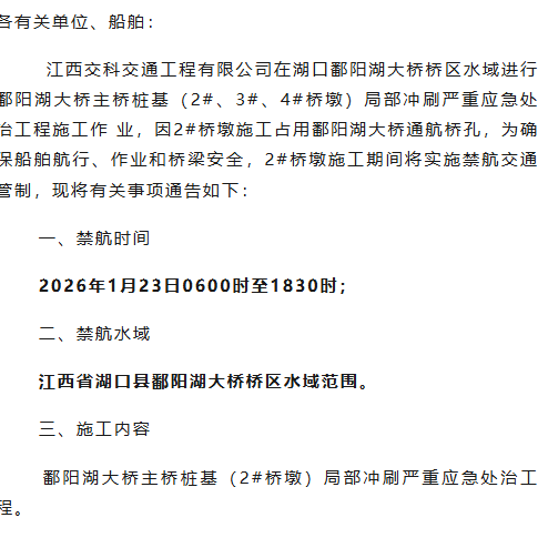 江西交科交通工程有限公司在湖口鄱阳湖大桥桥区水域进行鄱阳湖大桥主桥桩基局部冲刷严重应急处治工程施工作业,因2号桥墩施工占用鄱阳湖大桥通航桥孔,为确保船舶航行、作业和桥梁安全,2号桥墩施工期间将实施禁航交通管制,禁航时间为 2026年1月23日6时至18时30分;
