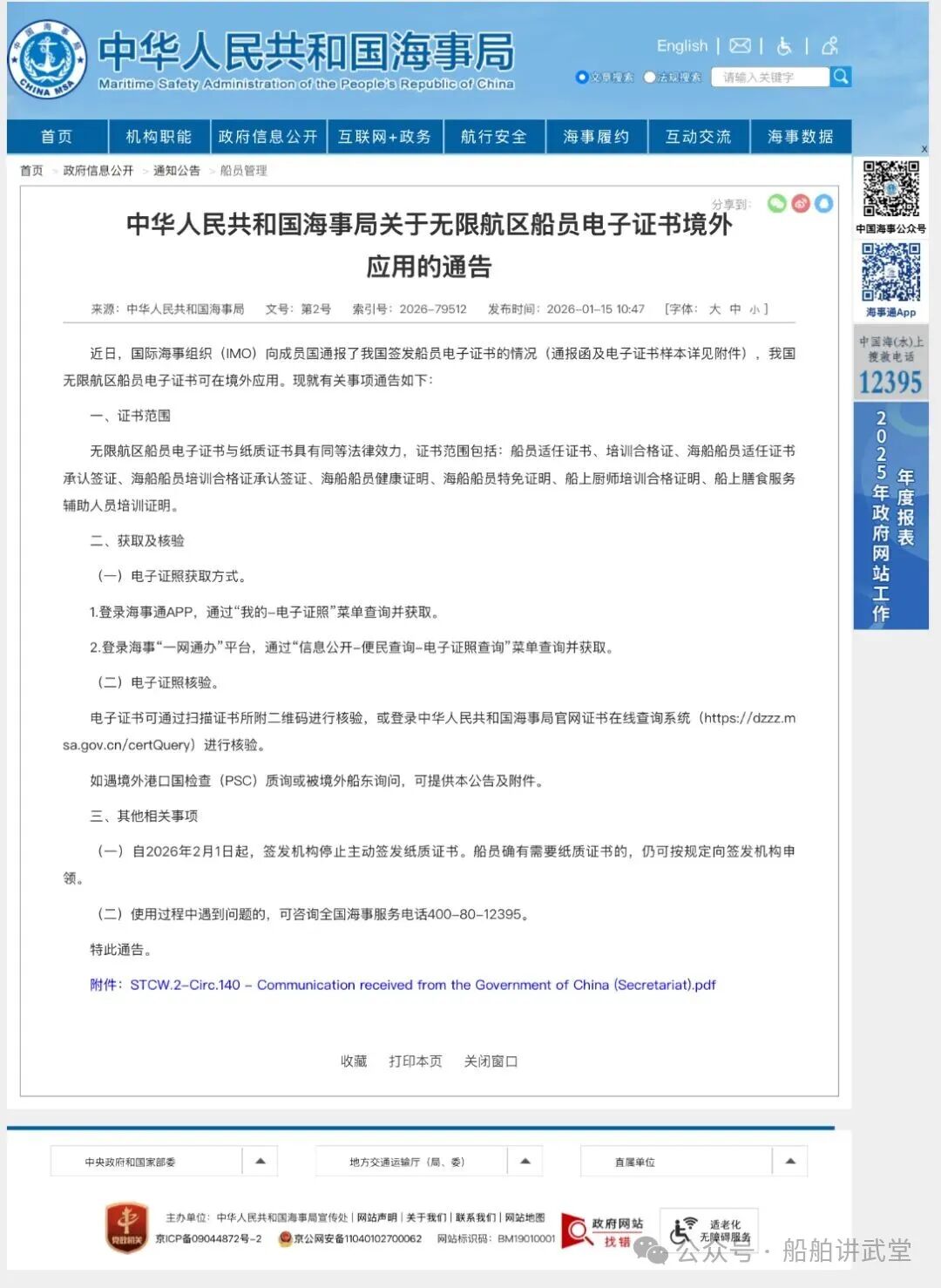 为便利大家上船任职、服务船舶境外营运,交通运输部海事局于2026年1月15日正式发布今年第2号通告,明确我国无限航区船员电子证书境外应用相关事宜,核心利好快收好!