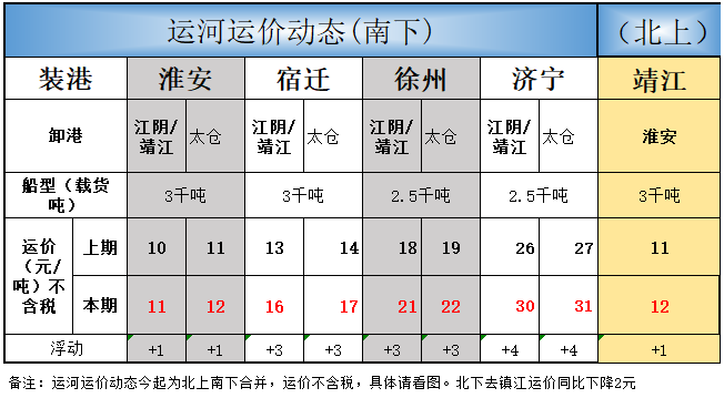 济宁到江阴/靖江运价上涨4元为30元/吨;