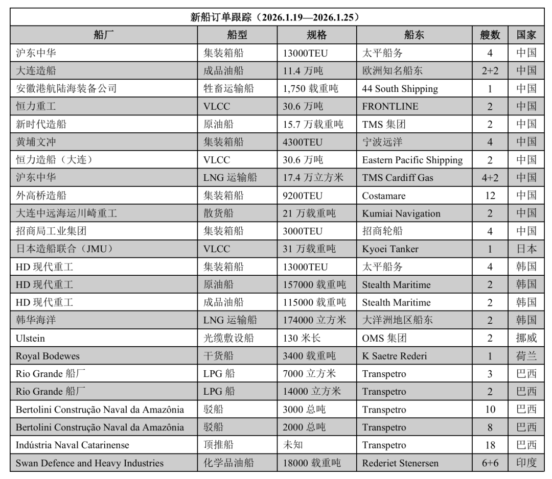 6【订单据国际船舶网跟踪:2026年1月19日至2026年1月25日,全球船厂共接获100+10艘新船订单。其中中国船厂接获39+4艘新船订单;日本船厂接获1艘新船订单;韩国船厂接获10艘新船订单;挪威、荷兰、巴西和和印度船厂也接获相关新船订单。