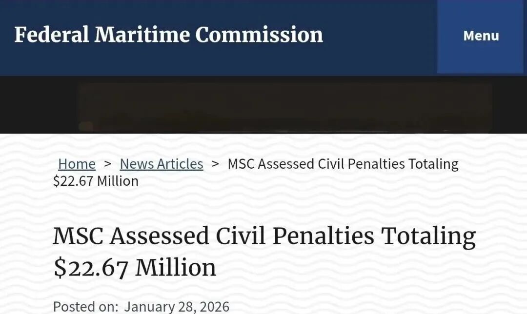 最新获悉:北京时间今天凌晨,美国联邦海事委员会(FMC)发布官方公告,宣布对地中海航运公司(MSC)处以合计2267万美元的罚款,原因是这家船公司多次违反《美国航运法》(Shipping Act)。