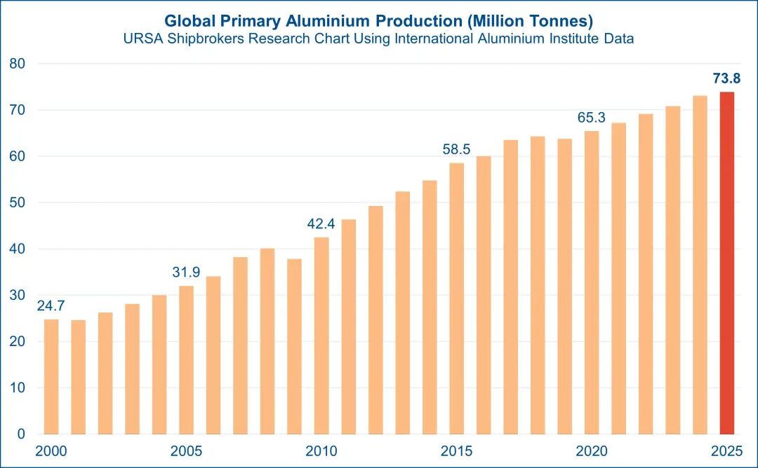 船舶经纪商Ursa Shipbrokers援引International Aluminium Institute(IAI)数据显示,2025年全球原铝产量达到7,380万吨的历史高位,同比小幅增长1.1%。与2000年相比,全球原铝产量累计增长约199%,反映出铝在交通运输、建筑、电力基础设施以及消费品制造等领域中的应用持续深化。
