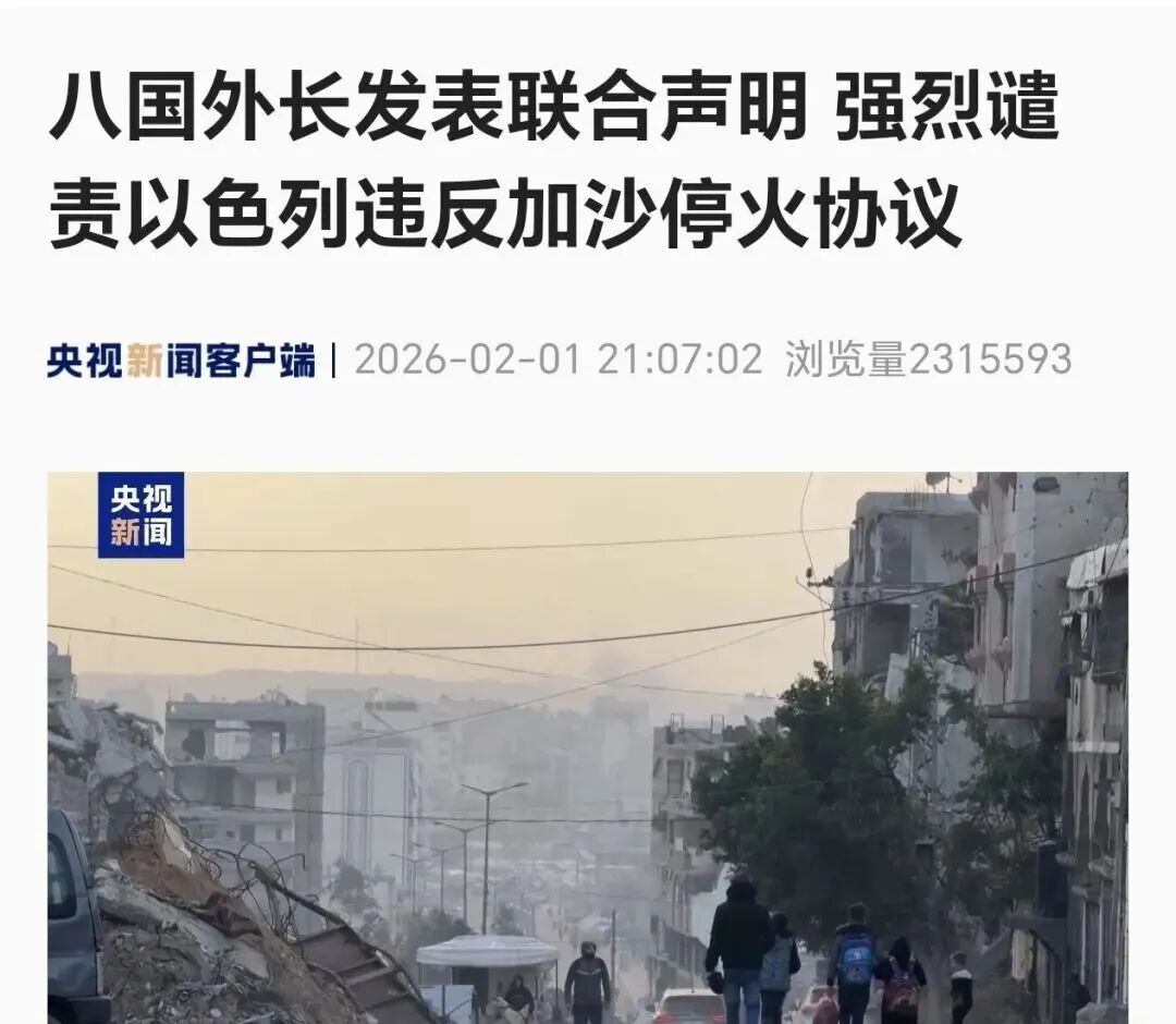 央视最新报道称:当地时间2月1日,卡塔尔外交部表示,卡塔尔、埃及、约旦、阿联酋、印尼、巴基斯坦、土耳其和沙特八国外交部长发表联合声明,强烈谴责以色列一再违反加沙停火协议,在近期导致一千多名巴勒斯坦人伤亡。