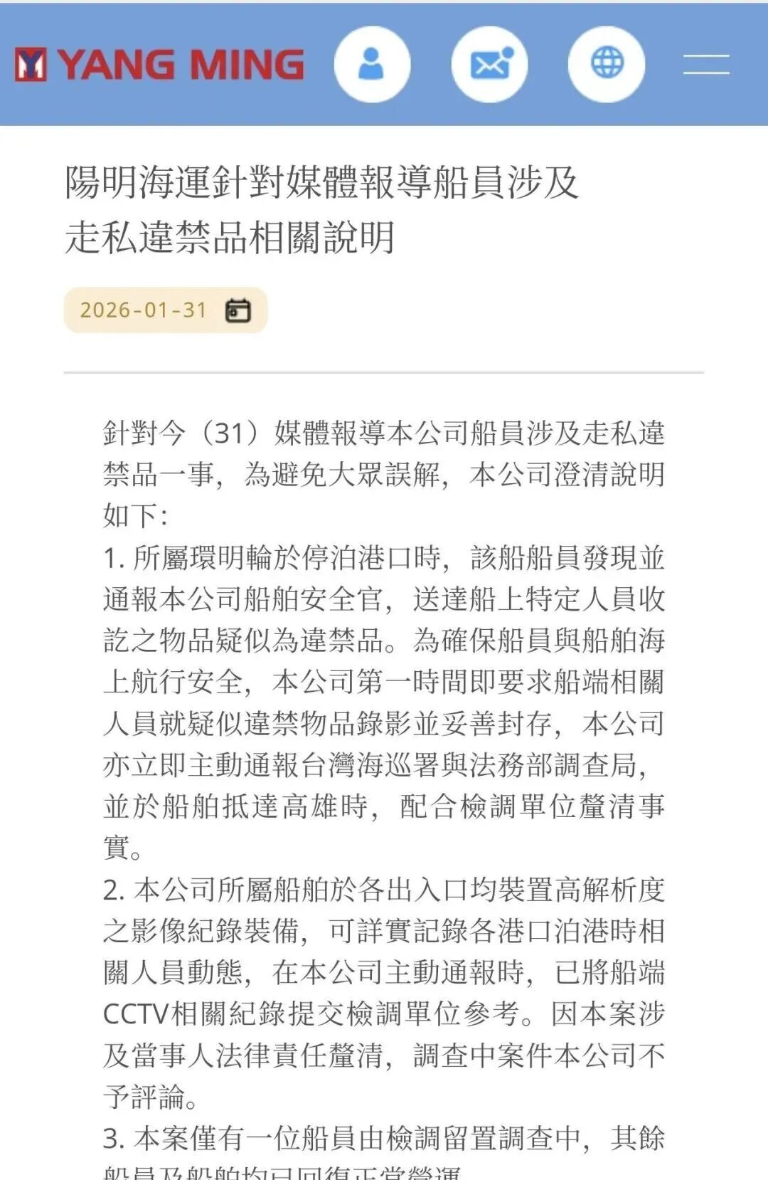 事件发生后,阳明海运为避免大众误解,官方发布《针对媒体报道船员涉及走私违禁品相关说明》,具体说明及澄清如下: