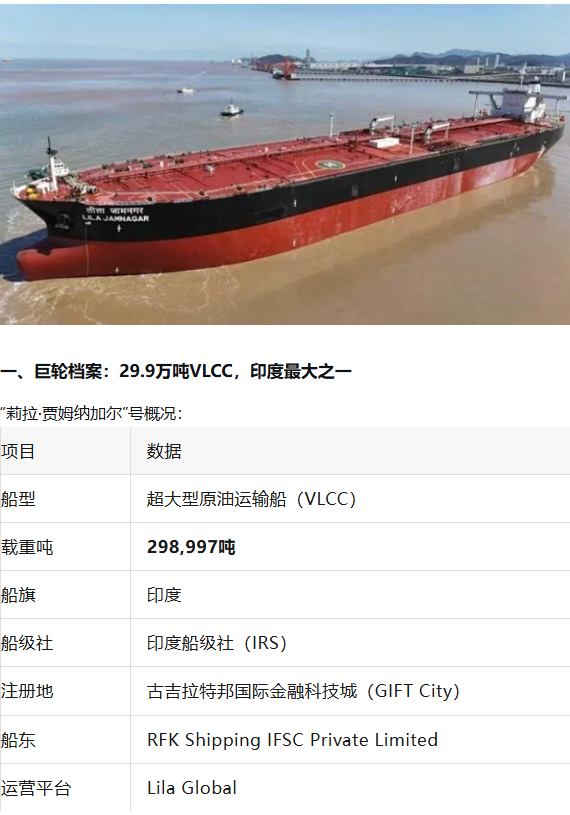 随印度船级社近日将一艘29.9万吨超大型原油运输船(VLCC)“莉拉·贾姆纳加尔”号 纳入船级社。这艘船是悬挂印度国旗的最大船舶之一,标志着印度油轮船队发展的重要跨越。该船由RFK Shipping IFSC Private Limited所有,通过Lila Global平台运营,并在古吉拉特邦国际金融科技城注册。29.9万吨,是VLCC的标准吨位。一艘这样的船,可以装载约200万桶原油,足够供应一座中型城市数月的用油需求。