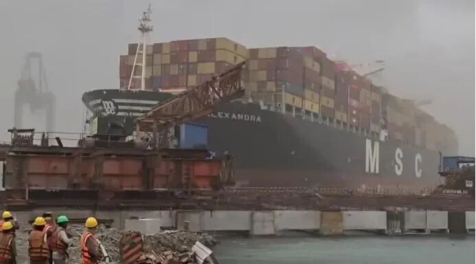 近日,印度最大集装箱港口蒙德拉港,遭遇非季节性强对流天气突袭,一艘长达366米的超大型集装箱船断缆失控,在港池内疯狂漂移,直逼在建码头,现场集装箱被吹倒,作业工人紧急逃离!此次“肇事”的是地中海航运旗下的MSC Alexandra号集装箱船。这艘2010年建成的巨轮,船长366米、型宽52米,运力高达14036TEU,堪称航运界的“巨无霸”。险情发生后,蒙德拉港管理部门第一时间启动应急响应机制:由于应急处置及时,并未造成人员伤亡。港口作业也逐步回归正轨。