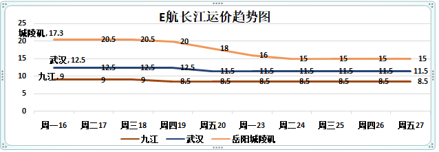 江阴到城陵矶的运价下跌3元为15元/吨。