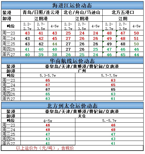 北方五港进江方向4-5万吨运价上涨1元为44元/吨;