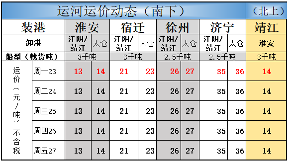 淮安到靖江运价上涨1元为13元/吨;